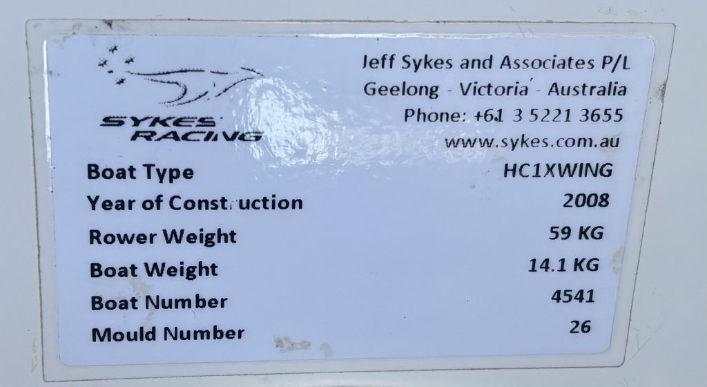 Well maintained Sykes single scull. 2008, mould 26 (59kg athlete weight).