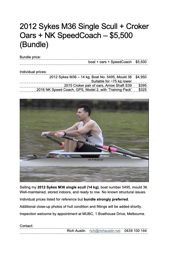 Selling my 2012 Sykes M36 single scull (14 kg), Boat No. 5495, Mould 36. Suitable for ~75 kg rower. Well-maintained, stored indoors, and ready to row. No known structural issues.