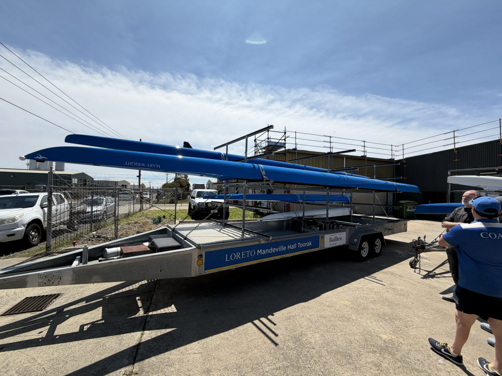5 racks high (top rack is removable), with 15 spaces available for boats. Extremely versatile. Well maintained and serviced every year- a great trailer for any club or school. Currently our Senior Program trailer.