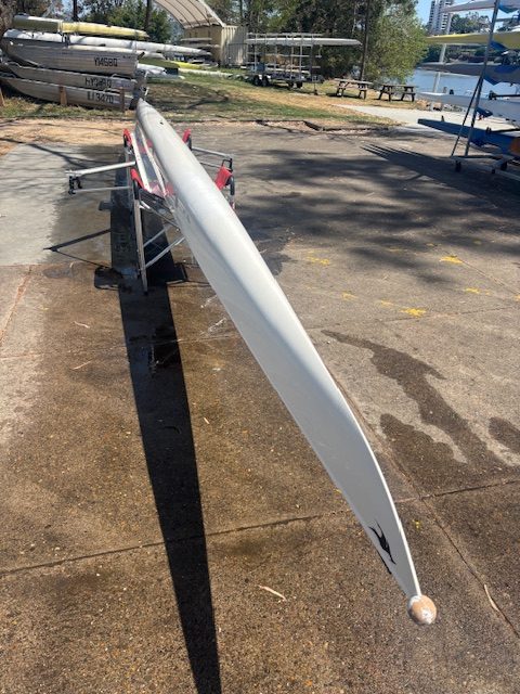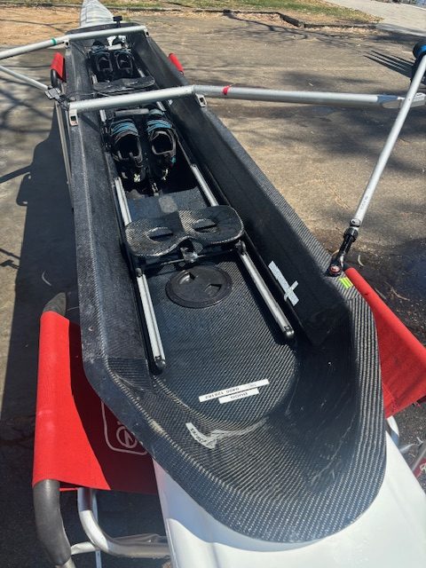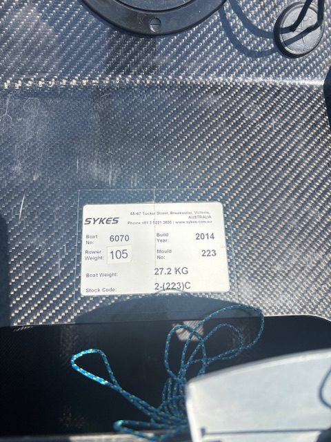 Carbon hull, seats & footplates. Against U2 shoes (EU47). 2- and 2x Sykes aluminum riggers. Both seats fitted with NK StrokeCoach wiring harnesses (including hull-mounted impeller and rating magnet). Custom Sykes heavy duty deluxe transport cover. Boat number 6070, Rower weight: 100kg. Ex-AIS and used as a private boat (not in the club fleet)