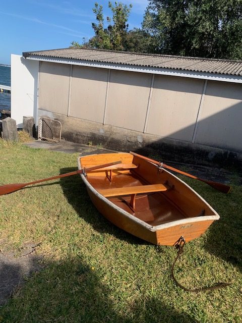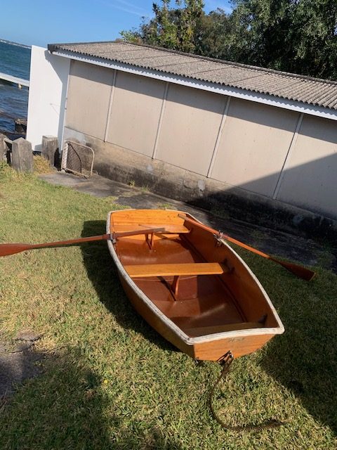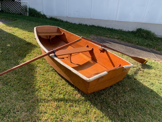 Rowing boat, flat-bottomed, seats 4, one set of oars. Suitable as yacht tender or pleasure rowing. 2.26m long, 1.21m wide, 30cm deep, easy to row, light to lift.