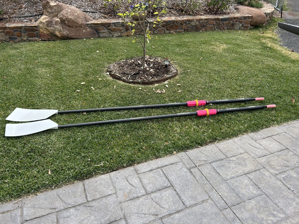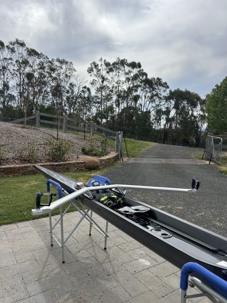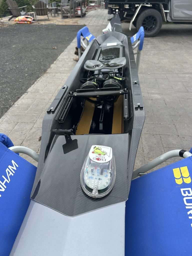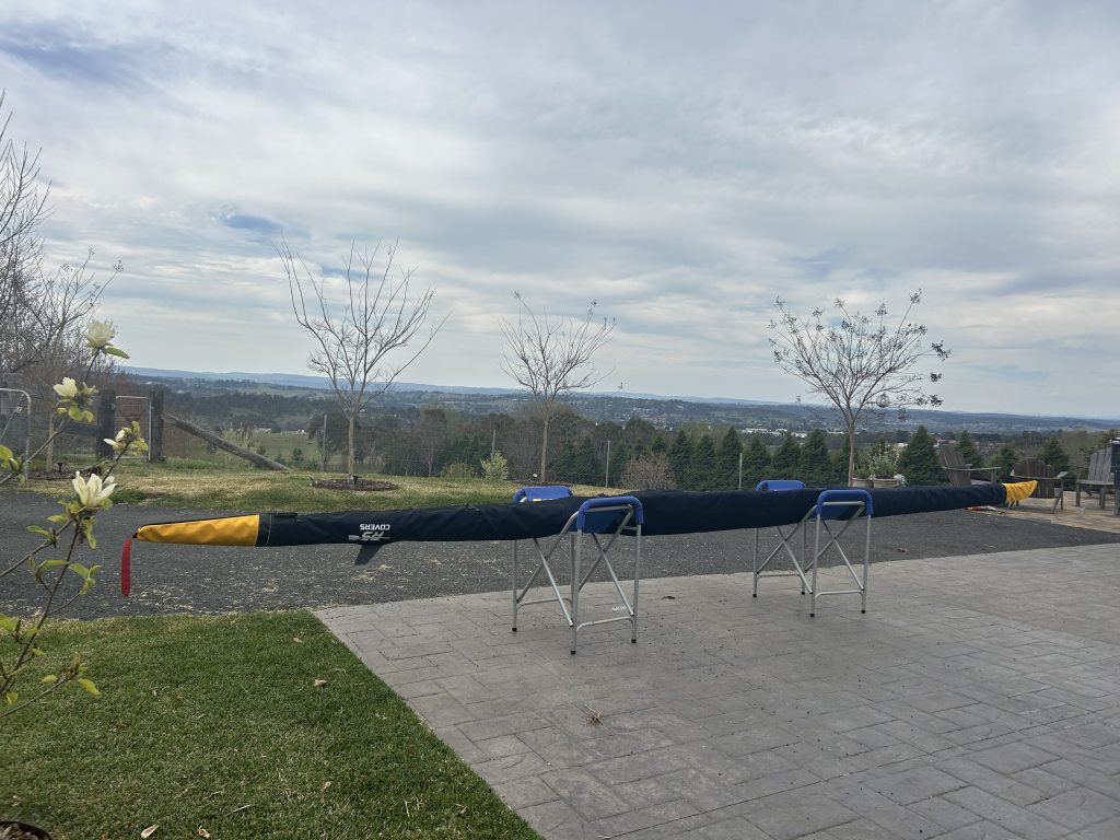 The following items are included with the boat: quick release rigger, 1 set of Croker S39 ‘soft’ Arrow oars and Croker oar bag, 2 pairs of quick release shoes (1x Bont rowing and 1x project B), 1 blue stroke coach, 2 Burnham trestles, 2 rechargeable frog lights, 1 navy and yellow custom made Racing Shell Cover and matching rigger cover, 1 PBR vehicle boat roof carrier rack.