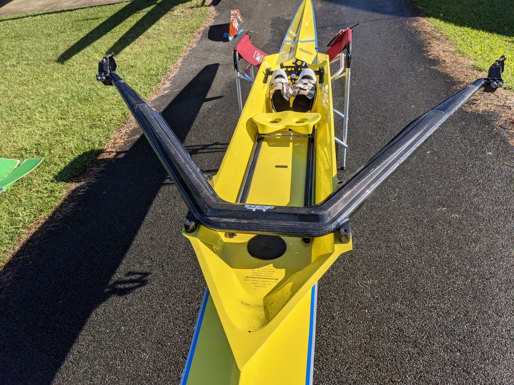 Ted Hall F1 Series Single. Mid Weight, suitable for 75kg to 90kg crew. Carbon Bow Rigger, Carbon Hull With Honeycomb Core. Build Number 1167. Includes Croker carbon oars S2 Soft Super Light, Set of trestles, Neoprene zipped boat & rigger covers. Shoes size 10, New set of seat bearing rollers.
